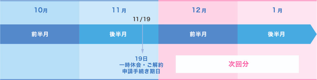 後半月の19日までに休会又は解約申請手続きを持って、サービスの更新は停止されます。