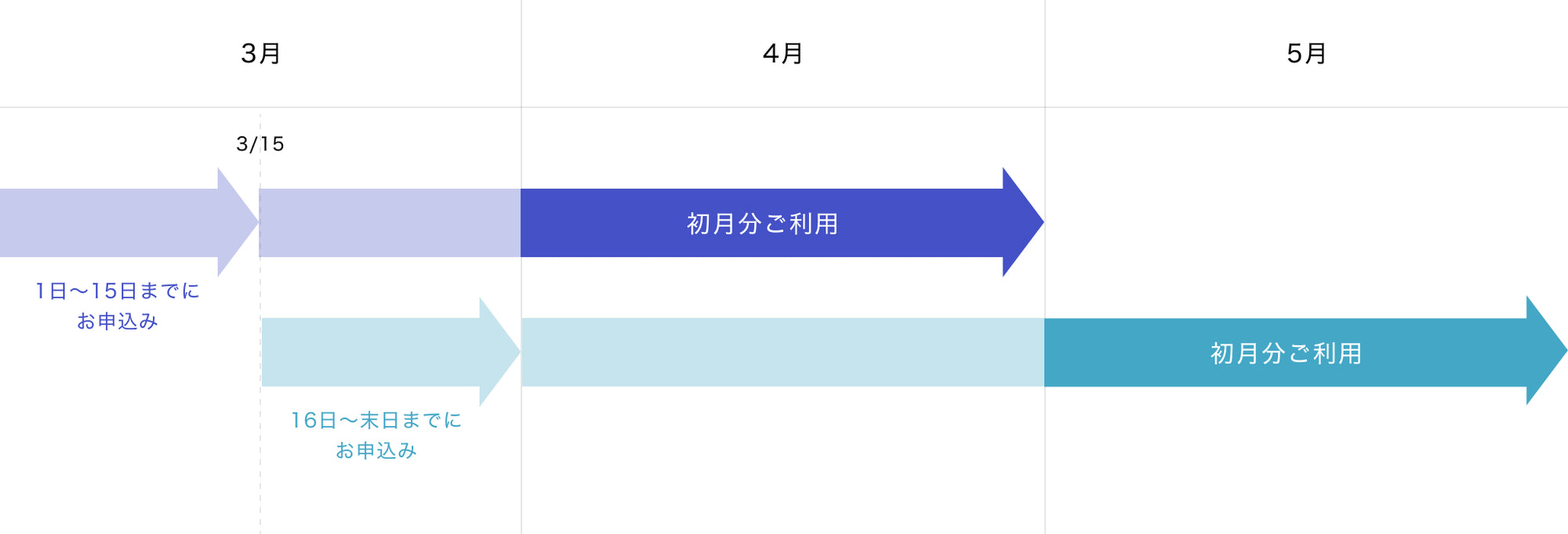 当月1日~15日までにお申し込み頂けた場合のご利用開始月は翌月となり、当月16日~当月末日までにお申し込み頂けた場合のご利用開始月は翌々月となります。