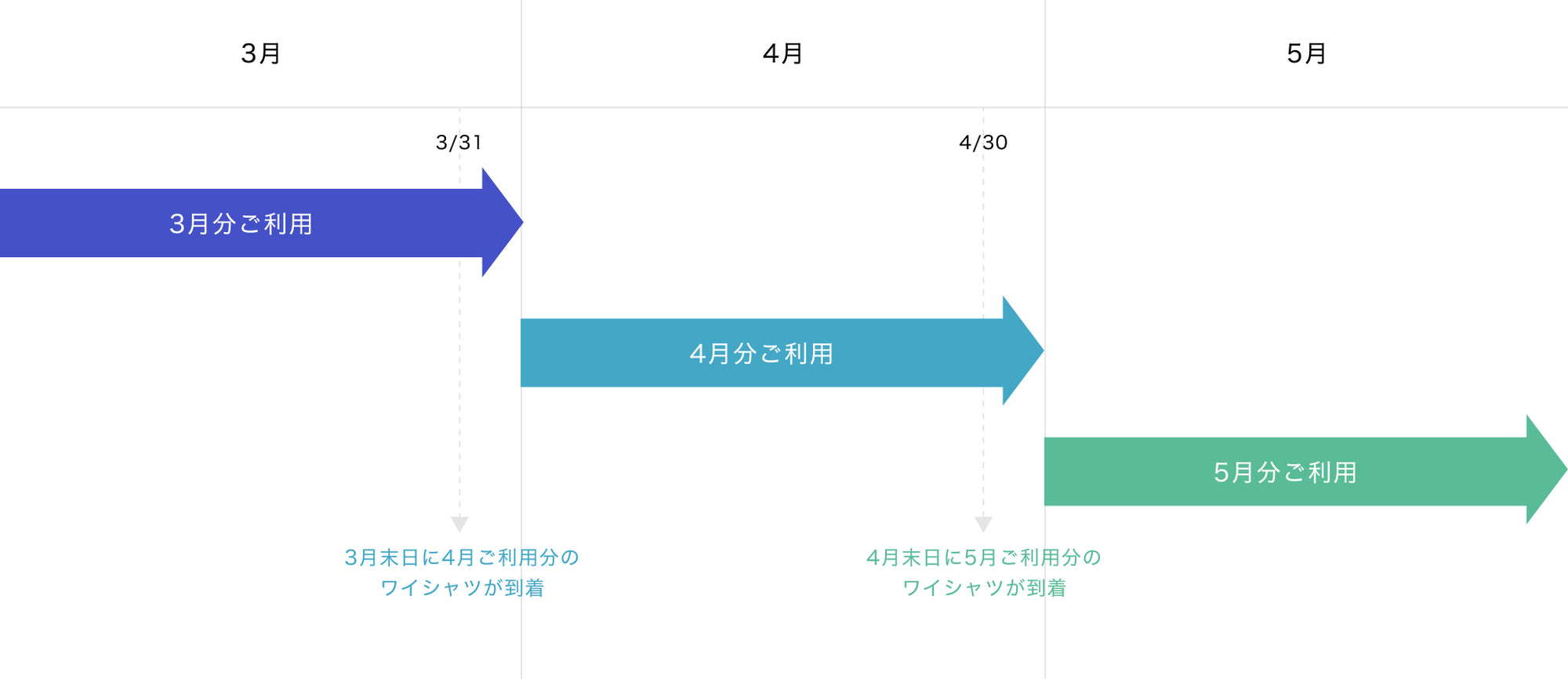 例)4月ご利用分のワイシャツは3月31日に、5月ご利用分のワイシャツは4月30日に宅配致します。