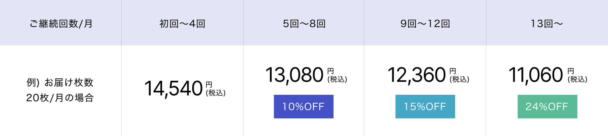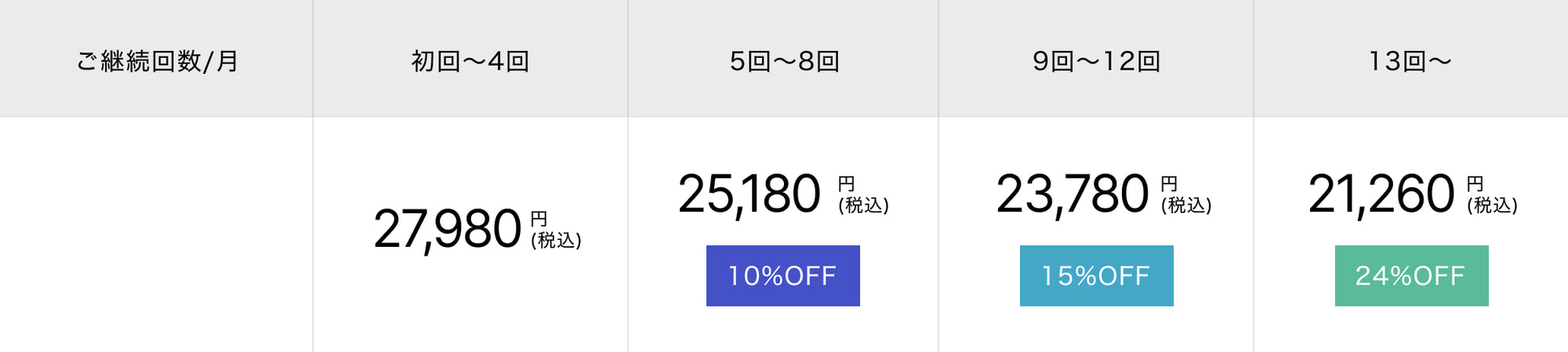 ご継続回数に応じて、ご提供価格が以下の通りおトクになっていきます。最大で24%OFF!