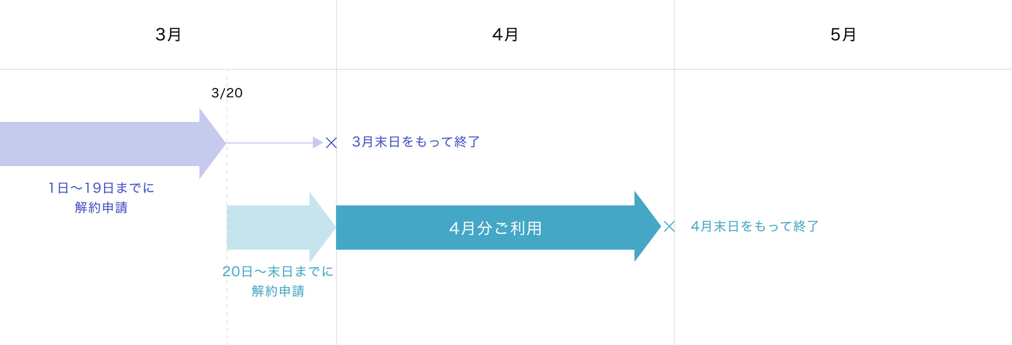 当月20日~当月末日までに解約申請を頂いた場合には、翌月末をもっての解約申請扱いとなります。