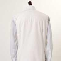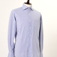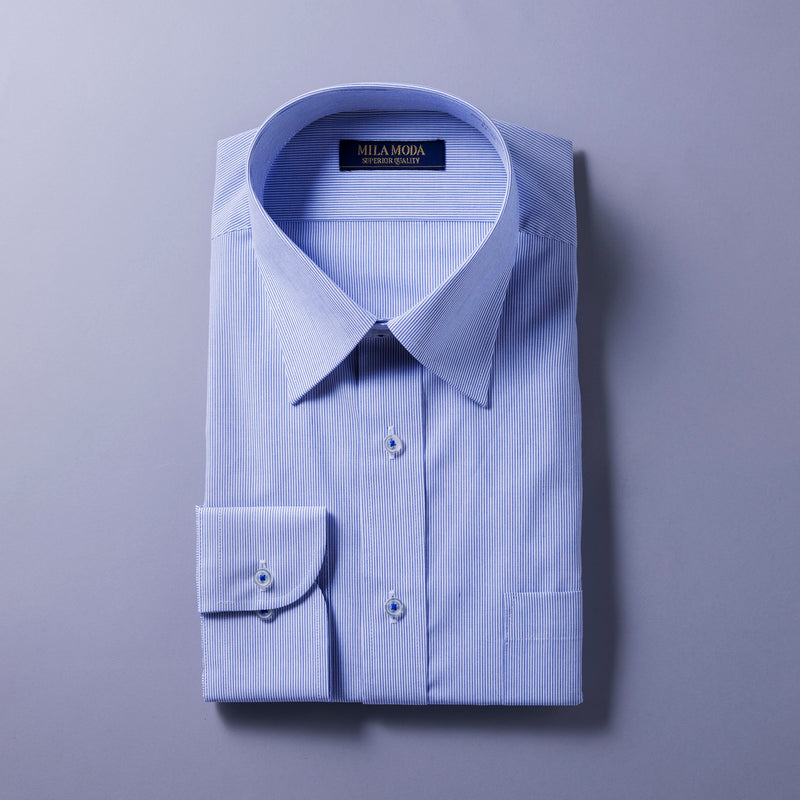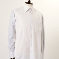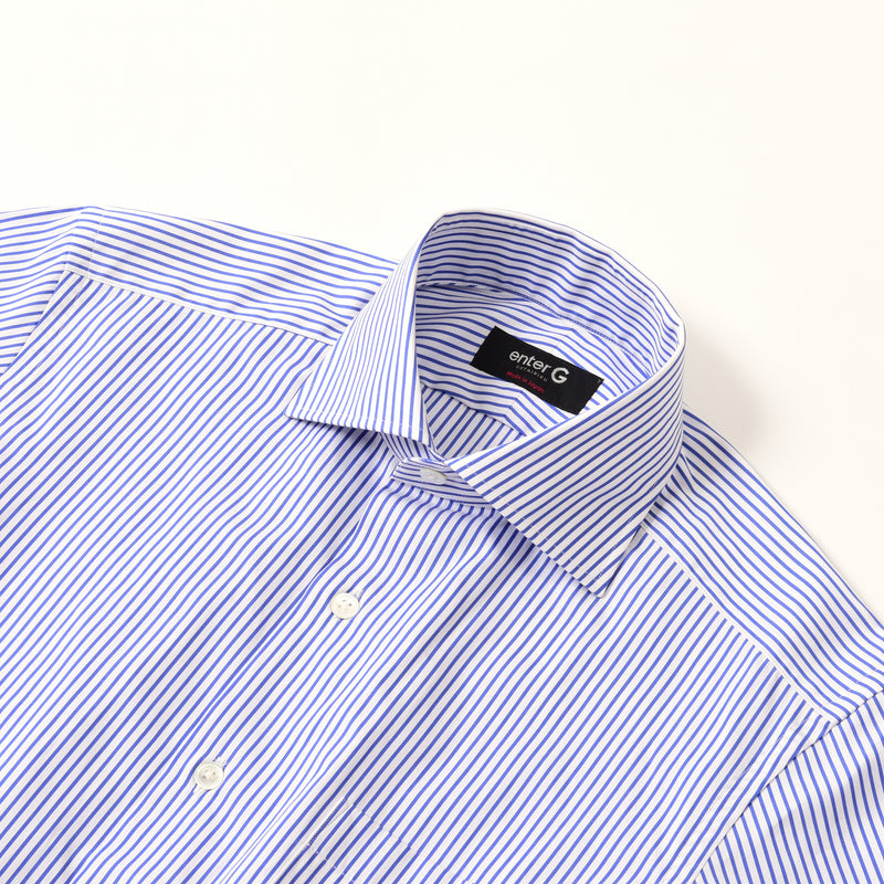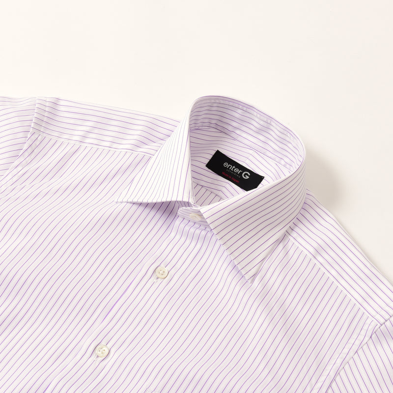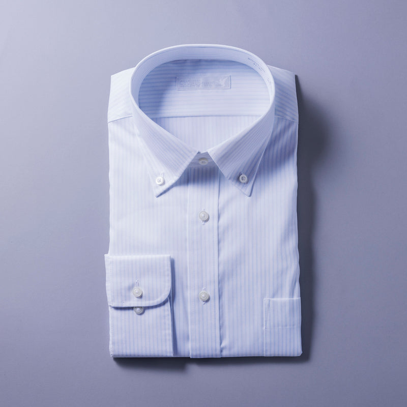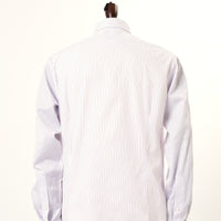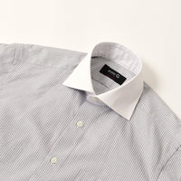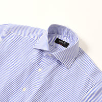 地組織ストライプと、カラーの細ストライプを交互にあわせた柄です。シンプルスタイルに少しこだわりを加えるシャツです。合わせ易いセミワイドカラーで、カフスもできるコンバーチブル仕様。